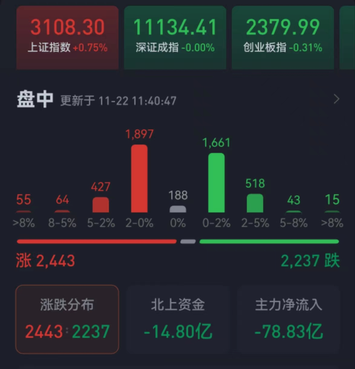 周二(11月22日),三大股指震蕩分化,漲跌不一。截至上午收盤(pán),上證指數(shù)漲幅達(dá)0.75%,報(bào)3108.30點(diǎn),收復(fù)3100點(diǎn);深證成指和創(chuàng)業(yè)板指跌幅分別為0%和0.31%;滬深兩市合計(jì)成交額5014.7億元,總體來(lái)看,兩市個(gè)股漲多跌少。