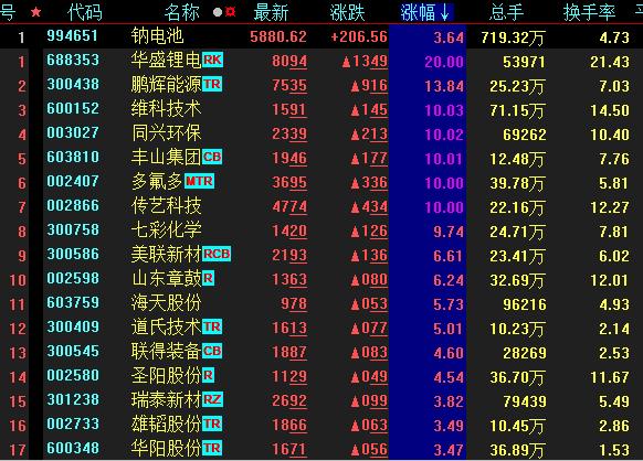 具體看,截至11月24日上午收盤,鈉電池板塊漲幅居首,達(dá)3.64%。其中,華盛鋰電20CM漲停,維科技術(shù)、同興環(huán)保、豐山集團(tuán)、多氟多、傳藝科技等概念股集體漲停。