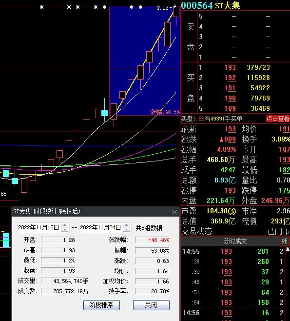 11月24日,熱門股ST大集漲停,截至收盤,報1.93元,連續(xù)8個交易日實現(xiàn)上漲,期間累計漲幅達48.46%??梢钥吹?,ST大集自11月1日開始啟動后,連續(xù)攀升,月內(nèi)累計漲幅達112.09%。