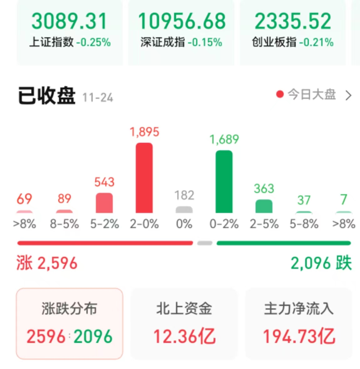 周四(11月24日),A股三大指數(shù)窄幅震蕩。截至收盤,上證指數(shù)跌0.25%報3089.31點,深證成指跌0.15%報10956.68點,創(chuàng)業(yè)板指跌0.21%報2335.52點;兩市合計成交7481億元,北向資金凈買入12.36億元??傮w來看,兩市個股漲多跌少。