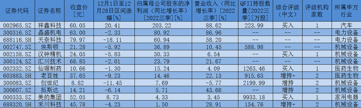 表:受10家及以上海外機(jī)構(gòu)調(diào)研公司中前三季度凈利潤實(shí)現(xiàn)同比增長(zhǎng)公司一覽