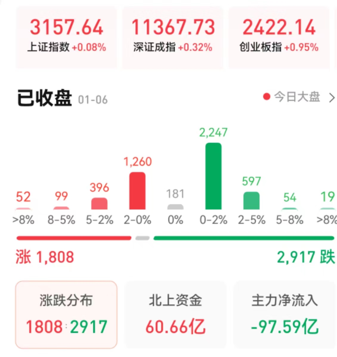 周五(1月6日),A股三大指數(shù)震蕩上行,全線飄紅。截至收盤(pán),上證指數(shù)微漲0.08%報(bào)3157.64點(diǎn),深證成指漲0.32%報(bào)11367.73點(diǎn),創(chuàng)業(yè)板指漲0.95%報(bào)2422.14點(diǎn),科創(chuàng)50指數(shù)漲0.77%;兩市合計(jì)成交8380億元,北向資金凈買入60.66億元。漲停個(gè)股達(dá)36只,跌停個(gè)股達(dá)14只。