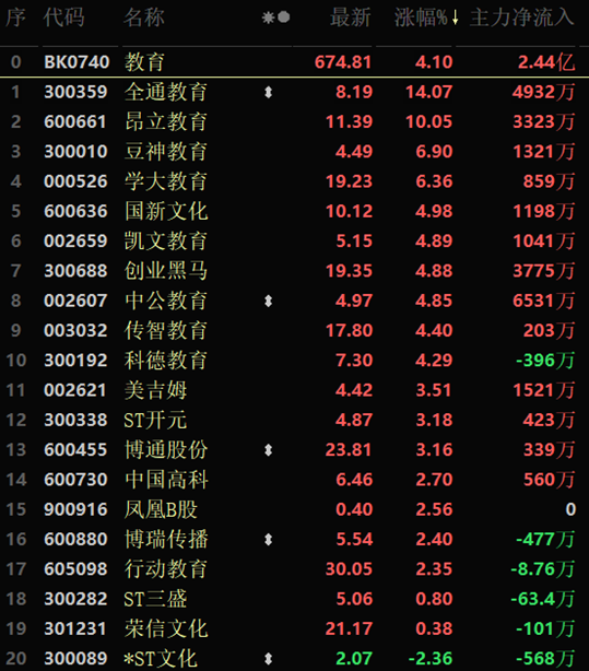 從早盤表現(xiàn)強(qiáng)勢(shì)的教育行業(yè)看,交易中的20只成份股有19只上漲,其中4只漲幅超5%。資金流向看,教育行業(yè)大單資金凈流入額為2.44億元,居行業(yè)第8位,排名第一的證券行業(yè),大單資金凈流入額為14.0億元。