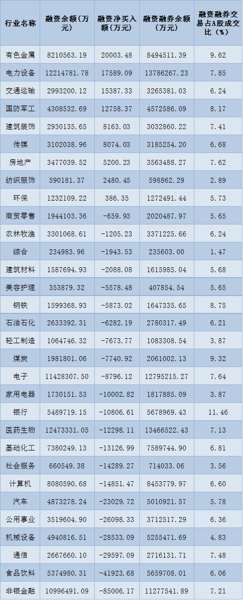 表:1月6日申萬一級(jí)行業(yè)兩融交易情況:
