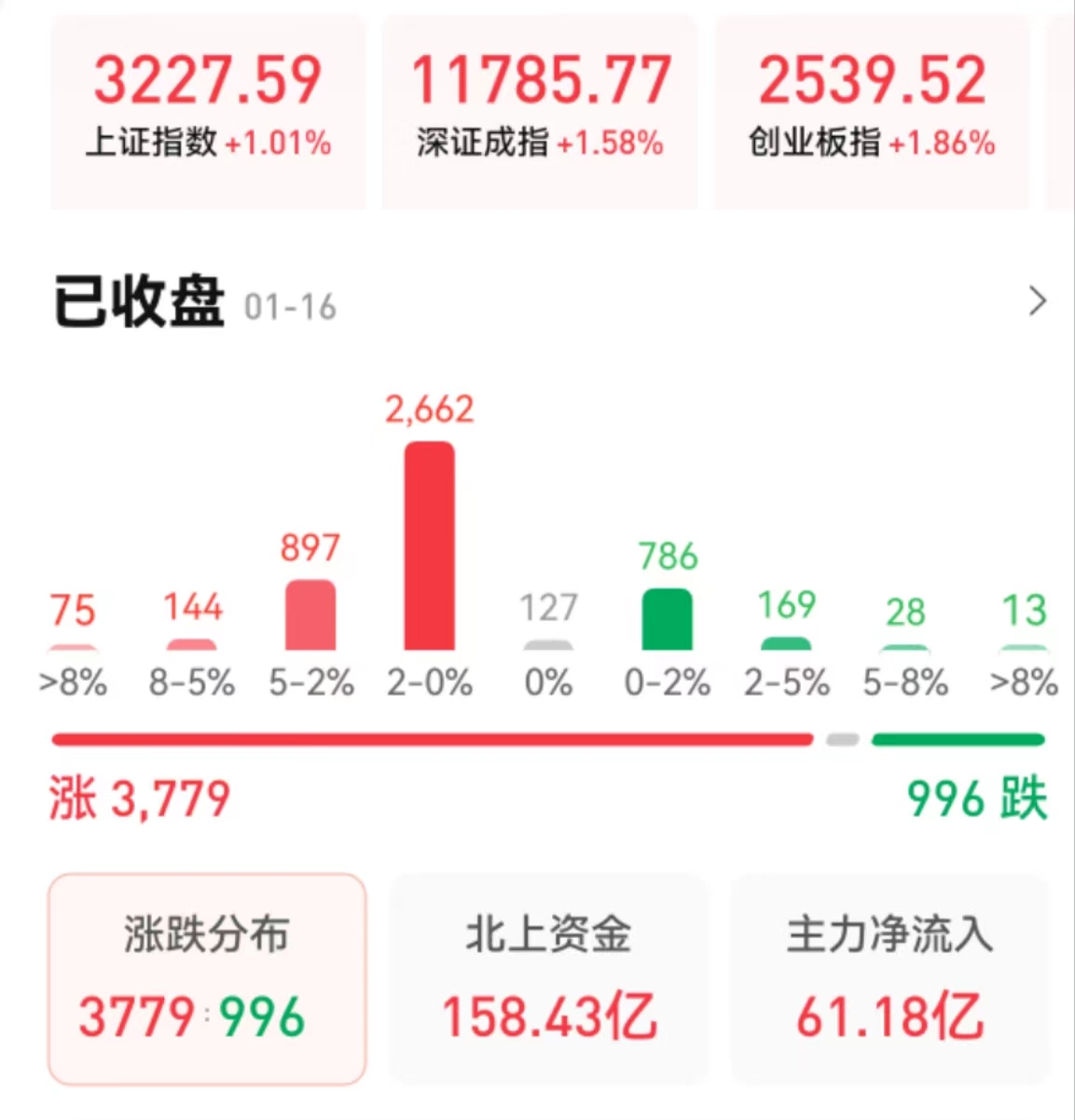周一(1月16日),A股三大指數(shù)震蕩上行,全線飄紅。截至收盤,上證指數(shù)漲1.01%報3227.59點,深成指漲1.58%報11785.77點,創(chuàng)業(yè)板指漲1.86%報2539.52點;兩市合計成交9171億元,創(chuàng)近一個月新高。北向資金凈買入158.43億元??傮w上看,兩市個股漲多跌少,其中,漲停個股達49只,跌停個股達12只。