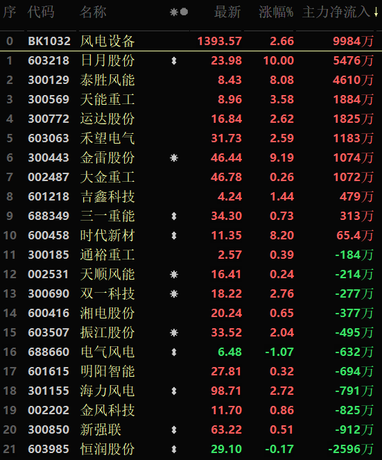 從早盤表現(xiàn)強勢的風電設備行業(yè)看,交易中的21只成份股有19只上漲,其中日月股份封漲停板,另有3只個股漲超5%。資金流向看,風電設備行業(yè)大單資金凈流入額為9984萬元,居行業(yè)第11位。