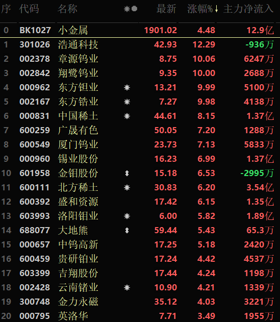 從早盤(pán)表現(xiàn)強(qiáng)勢(shì)的小金屬行業(yè)看,交易中的38只成份股有35只上漲,其中章源鎢業(yè)、翔鷺鎢業(yè)、東方鉭業(yè)和東方鋯業(yè)封漲停板,另有11只個(gè)股漲超5%。資金流向看,小金屬行業(yè)大單資金凈流入額為12.9億元,居行業(yè)第1位。