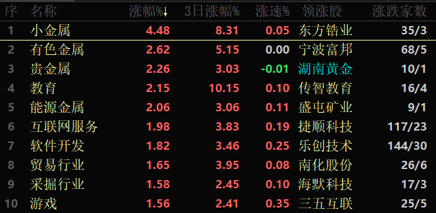 東方財(cái)富行業(yè)方面,截至2月1日11:30,86類(lèi)行業(yè)中75類(lèi)上漲,占比87.21%,其中,小金屬行業(yè)漲幅居首,達(dá)4.48%,此外,有色金屬、貴金屬和教育等行業(yè)漲幅也超過(guò)2%。下跌方面,航空機(jī)場(chǎng)行業(yè)跌幅居首,達(dá)1.11%。