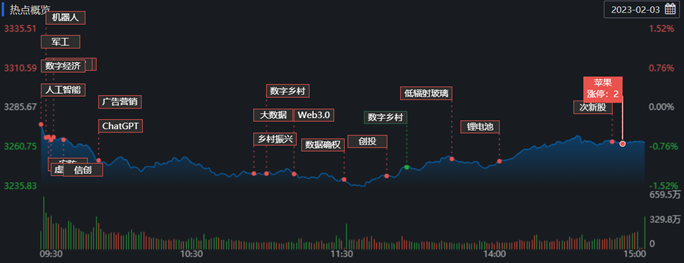 從概念板塊來看,東方財富363個概念板塊中,173個上漲,占比47.66%。ChatGPT概念領(lǐng)漲,漲幅達5.83%,此外,數(shù)據(jù)確權(quán)、Web3.0、華為歐拉、虛擬數(shù)字人、遠程辦公、DRG/DIP等板塊漲幅均超3%。下跌方面,毛發(fā)醫(yī)療領(lǐng)跌,跌幅為2.11%,此外,還有包括乳業(yè)、啤酒概念、PVDF概念在內(nèi)的16個概念板塊跌幅均超1%。