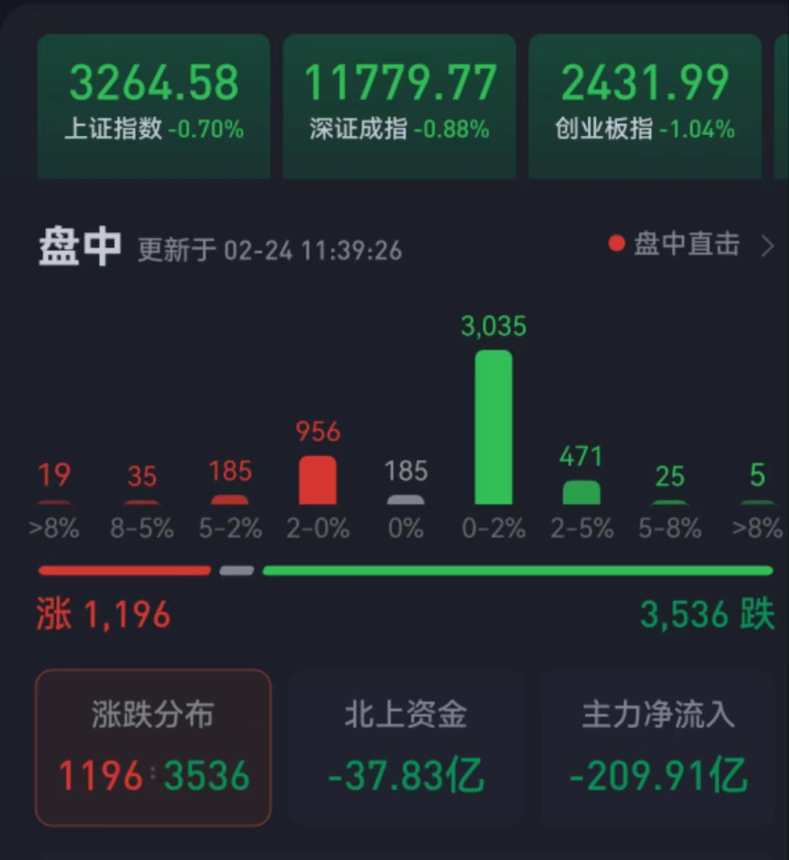 周五(2月24日),三大股指震蕩回落,全線下跌。截至上午收盤,上證指數(shù)跌幅達0.70%,報3264.58點;深證成指和創(chuàng)業(yè)板指跌幅分別為0.88%和1.04%;滬深兩市合計成交額4576.6億元,總體來看,兩市個股跌多漲少。其中,漲停個股達10只,跌停個股達3只。