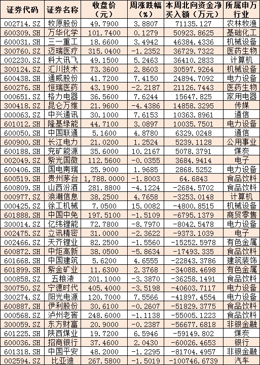 資金方面,本周,北向資金凈賣出金額達41.24億元,終結(jié)連續(xù)14周凈買入態(tài)勢。從前十大成交活躍股來看,本周,牧原股份、萬華化學(xué)等2只個股,北向資金凈買入金額均超5億元。另外,比亞迪、中國平安、招商銀行等個股遭北向資金凈賣出金額均超6億元。