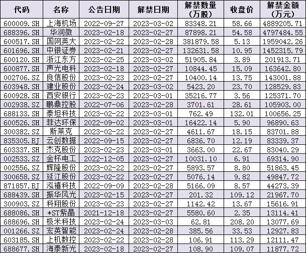 與此同時,統(tǒng)計顯示,下周(2月27日-3月3日)共有71家公司限售股陸續(xù)解禁,按最新收盤價計算,解禁市值為1487.56億元。具體來看,解禁市值居前三位的是上海機場(488.9億元)、華潤微(479.75億元)、國網(wǎng)英大(195.9億元)。