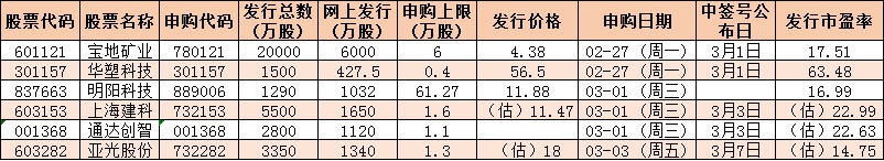 根據(jù)發(fā)行安排,下周(2月27日-3月3日)共有6只新股發(fā)行,其中科創(chuàng)業(yè)板1只(華塑科技)、滬市3只(寶地礦業(yè)、上海建科、亞光股份)、深市1只(通達創(chuàng)智)、北交所1只(明陽科技)。