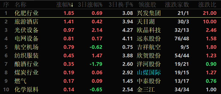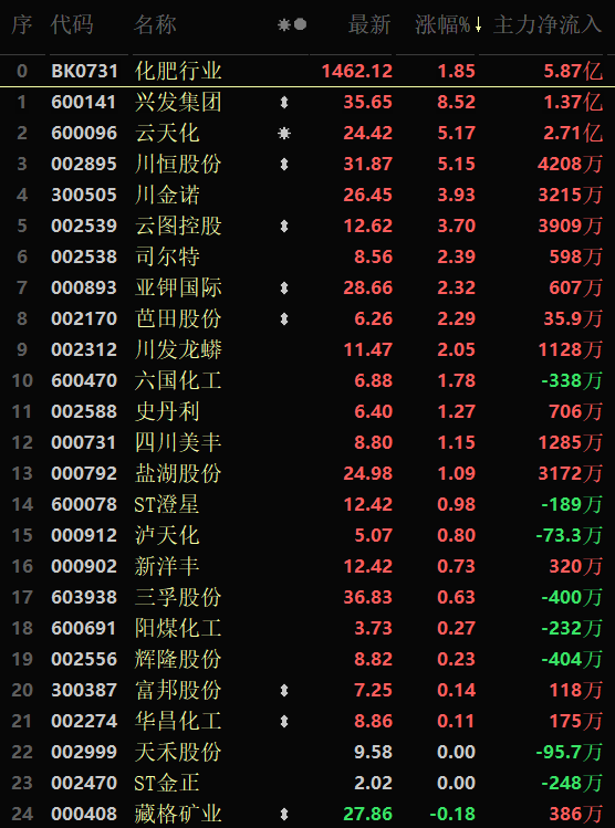 從早盤(pán)表現(xiàn)相對(duì)強(qiáng)勢(shì)的化肥行業(yè)看,交易中的24只成分股中有21只上漲,其中,有3只個(gè)股漲幅超5%。資金方面,有5.87億元大單資金凈流入該行業(yè),居各行業(yè)第1位。