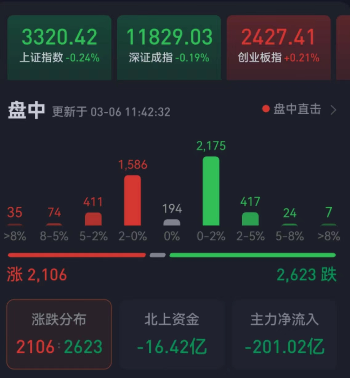 周一(3月6日),三大股指繼續(xù)震蕩分化,漲跌不一。截至上午收盤,上證指數(shù)跌幅達0.24%,報3320.42點;深證成指跌幅達0.19%,創(chuàng)業(yè)板指漲幅達0.21%;滬深兩市合計成交額6144.5億元,總體來看,兩市個股跌多漲少。漲停個股達25只,跌停個股有1只。