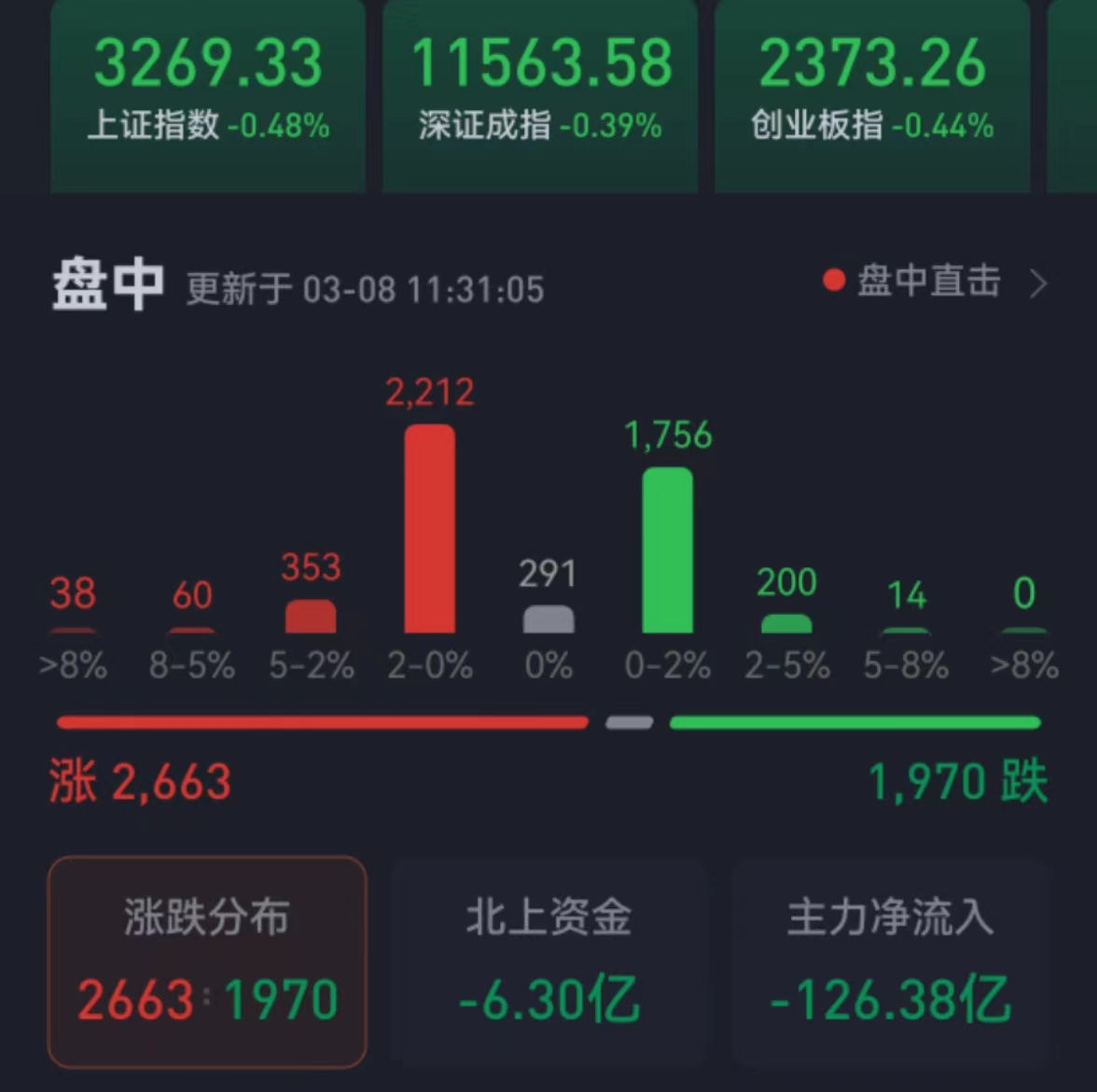 周三(3月8日),三大股指繼續(xù)震蕩整理,略有回落。截至上午收盤,上證指數(shù)跌幅達(dá)0.48%,報3269.33點;深證成指和創(chuàng)業(yè)板指跌幅分別為0.39%和0.44%;滬深兩市合計成交額4447.2億元,總體來看,兩市個股漲多跌少。