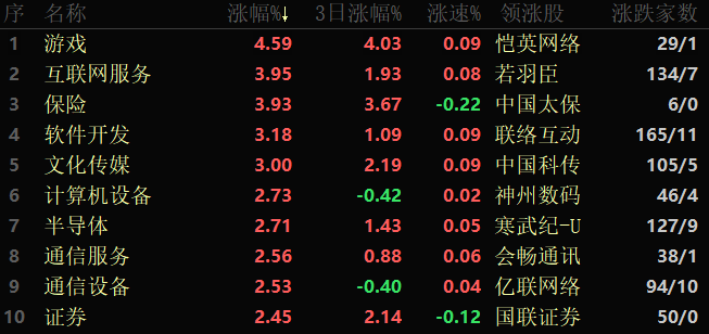 東方財富行業(yè)方面,截至3月17日11:30,86個行業(yè)板塊中76類上漲,占比88.37%,其中,游戲行業(yè)漲幅居首,達(dá)4.59%,另有包括互聯(lián)網(wǎng)服務(wù)、保險、軟件開發(fā)和文化傳媒等行業(yè)漲幅均超3%。下跌方面,中藥跌幅居首,達(dá)0.85%。