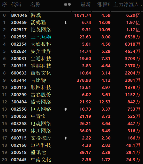 從早盤表現(xiàn)強勢的游戲行業(yè)看,該行業(yè)交易中的30只成分股中有29只上漲,其中,有8只個股漲幅超5%。資金方面,有6.20億元大單資金凈流入該行業(yè),居各行業(yè)資金凈流入排名第8位。