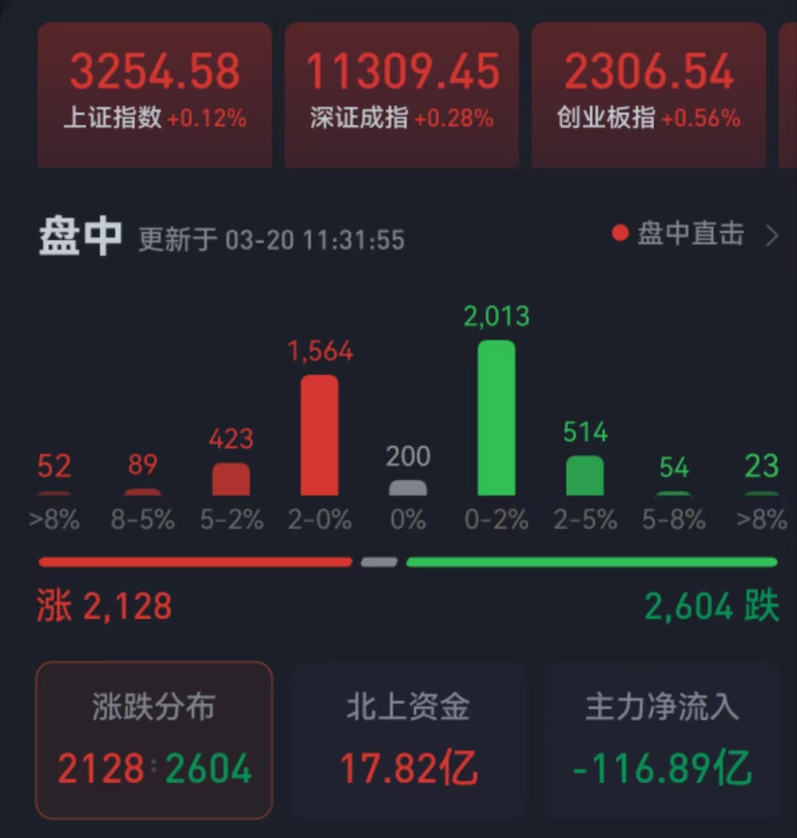 周一(3月20日),三大股指震蕩攀升,全線飄紅。截至上午收盤,上證指數(shù)漲幅達0.12%,報3254.58點;深證成指和創(chuàng)業(yè)板指漲幅分別達0.28%和0.56%;滬深兩市合計成交額7048.7億元。