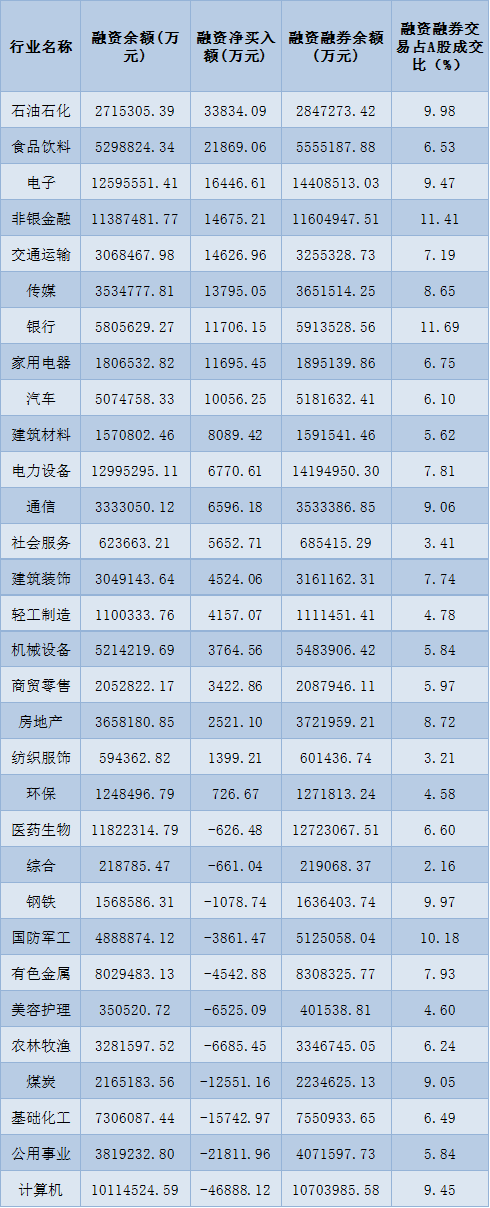 表:3月30日申萬一級(jí)行業(yè)兩融交易情況: