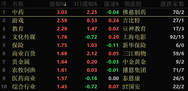 東方財(cái)富行業(yè)方面,截至3月31日11:30,86個(gè)行業(yè)板塊中68個(gè)上漲,占比79.07%,其中,中藥行業(yè)漲幅居前,達(dá)3.03%,此外,游戲和教育行業(yè)漲幅均超2%。下跌方面,船舶制造跌幅居首,達(dá)1.41%。