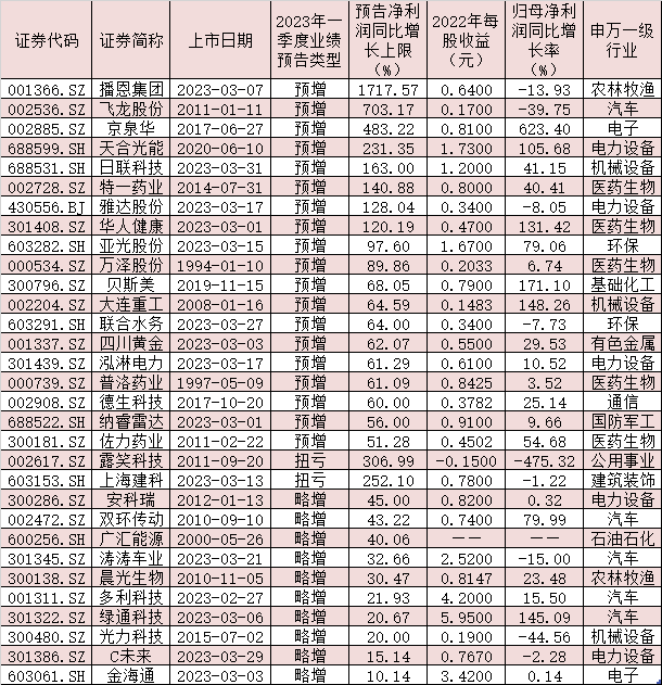 從預(yù)告2023年一季度歸母凈利潤(rùn)同比增幅上限來看,在上述31家業(yè)績(jī)預(yù)喜公司中,有8家公司2023年一季度歸母凈利潤(rùn)同比增幅上限均在100%及以上,播恩集團(tuán)預(yù)計(jì)今年一季度歸母凈利潤(rùn)同比增幅上限最高,達(dá)到1717.57%,飛龍股份緊隨其后,預(yù)計(jì)今年一季度歸母凈利潤(rùn)同比增幅上限也達(dá)703.17%,京泉華、天合光能等2家公司預(yù)計(jì)2023年一季度歸母凈利潤(rùn)同比增幅上限也均逾200%。另外,日聯(lián)科技、特一藥業(yè)、雅達(dá)股份、華人健康等4家公司2023年一季度歸母凈利潤(rùn)也有望同比增幅上限均在100%及以上。