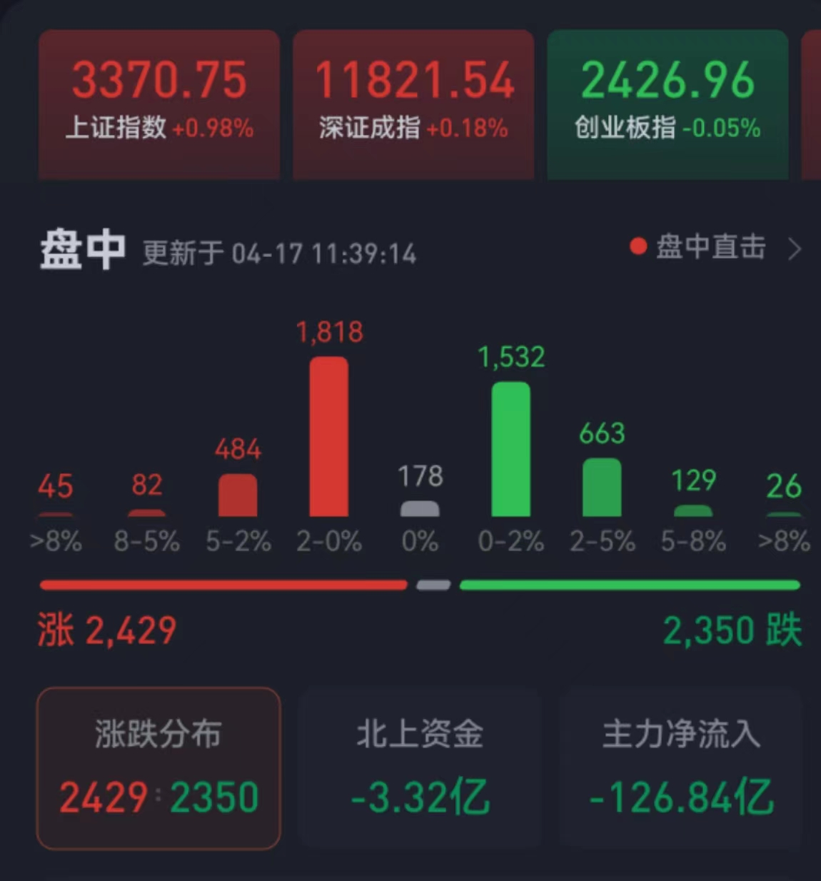 周一(4月17日),三大股指震蕩分化。截至上午收盤,上證指數(shù)漲幅達(dá)0.98%,報3370.75點;深證成指漲幅為0.18%,創(chuàng)業(yè)板指跌幅為0.05%;滬深兩市合計成交額7288.2億元,總體來看,兩市個股漲多跌少。