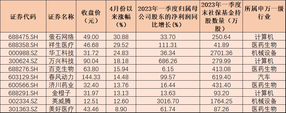 隨著上市公司今年一季報的陸續(xù)披露,社?;鸬淖钚鲁謧}動向也備受投資者關(guān)注。Choice數(shù)據(jù)顯示,截至4月19日16時,A股市場中有174家上市公司發(fā)布了2023年一季報,其中,有119家上市公司今年一季度凈利潤實現(xiàn)同比增長,占比68.39%。值得一提的是,在已披露的174家上市公司中,有27家公司前十大流通股股東名單中出現(xiàn)社?;鸬纳碛?。