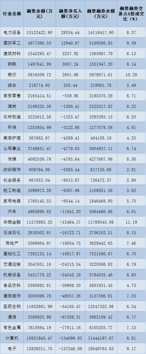 表:4月21日申萬一級行業(yè)兩融交易情況:
