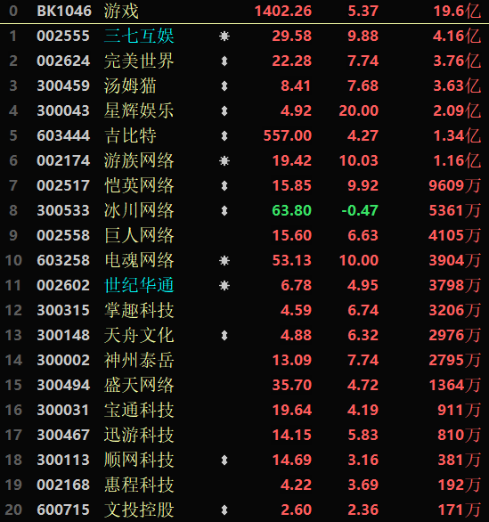 從早盤表現(xiàn)強勢的游戲行業(yè)看,交易中的29只成份股中26只上漲,其中,有13只個股漲幅超5%。資金方面,有19.6億元大單資金凈流入該行業(yè),居各行業(yè)第1位。