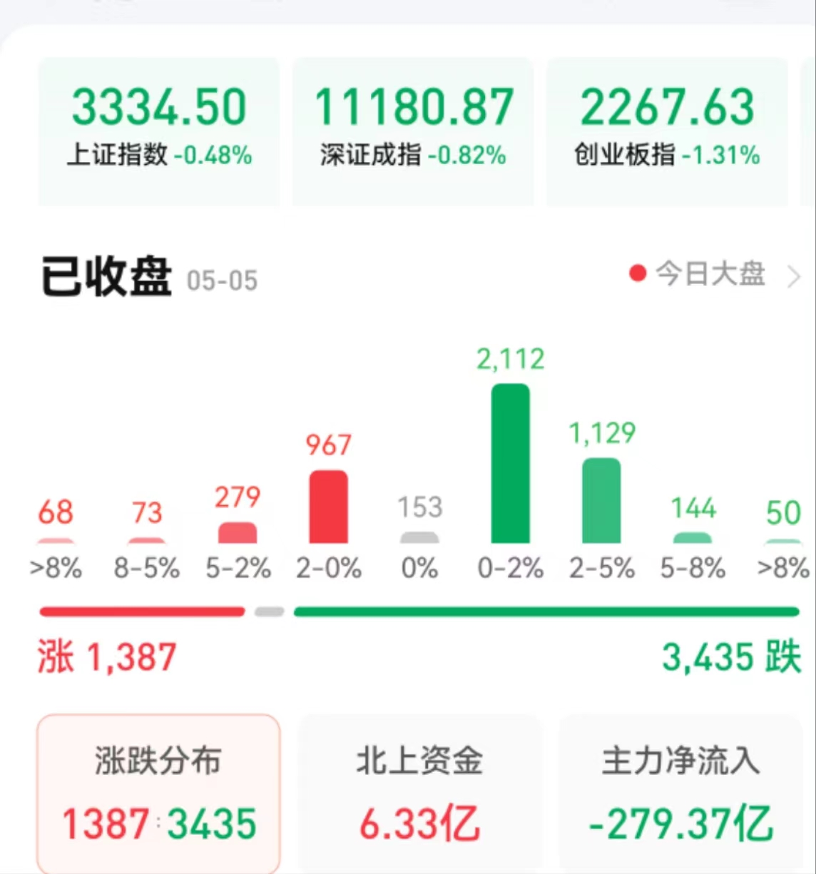 周五(5月5日),A股三大股指震蕩回落,全線下跌。截至收盤,上證指數(shù)跌0.48%報(bào)3334.5點(diǎn),深成指跌0.82%報(bào)11180.87點(diǎn),創(chuàng)業(yè)板指跌1.31%報(bào)2267.63點(diǎn),科創(chuàng)50指數(shù)跌1.42%;兩市合計(jì)成交10712億元,連續(xù)第21個(gè)交易日突破萬(wàn)億元,北向資金凈買入6.33億元??傮w上看,兩市個(gè)股跌多漲少。其中,漲停個(gè)股達(dá)50只,跌停個(gè)股達(dá)50只。