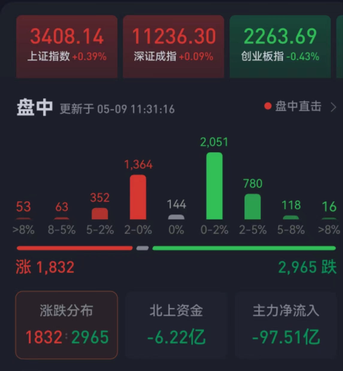 周二(5月9日),三大股指震蕩分化,漲跌不一。截至上午收盤(pán),上證指數(shù)漲0.39%,報(bào)3408.14點(diǎn),成功站上3400點(diǎn);深證成指微漲0.09%,創(chuàng)業(yè)板指跌0.43%;滬深兩市合計(jì)成交額7599.9億元,總體來(lái)看,兩市個(gè)股跌多漲少。