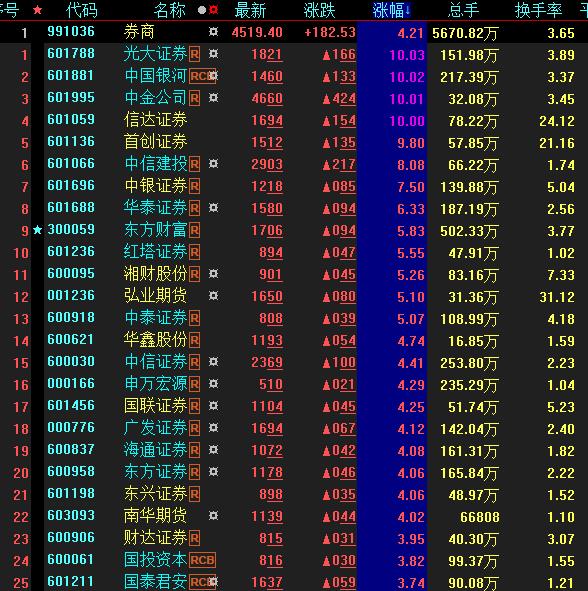 具體看,截至5月9日上午收盤(pán),券商板塊漲幅居首達(dá)4.21%。其中,光大證券、中國(guó)銀河、中金公司、信達(dá)證券等多只券商股集體漲停。