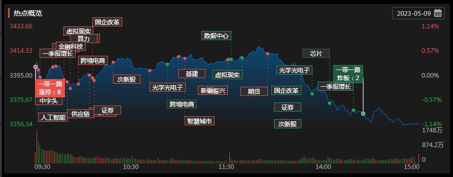 周二(5月9日),A股三大股指震蕩回落,全線下跌。截至收盤,上證指數(shù)跌1.1%報3357.67點,深證成指跌0.90%報11125.02點,創(chuàng)業(yè)板指跌1.21%報2245.82點;兩市合計成交金額12218億元,連續(xù)第23個交易日突破萬億元,北向資金凈買入9.83億元??傮w上看,兩市個股跌多漲少,超4000只個股下跌。其中,漲停個股達24只,跌停個股達72只。