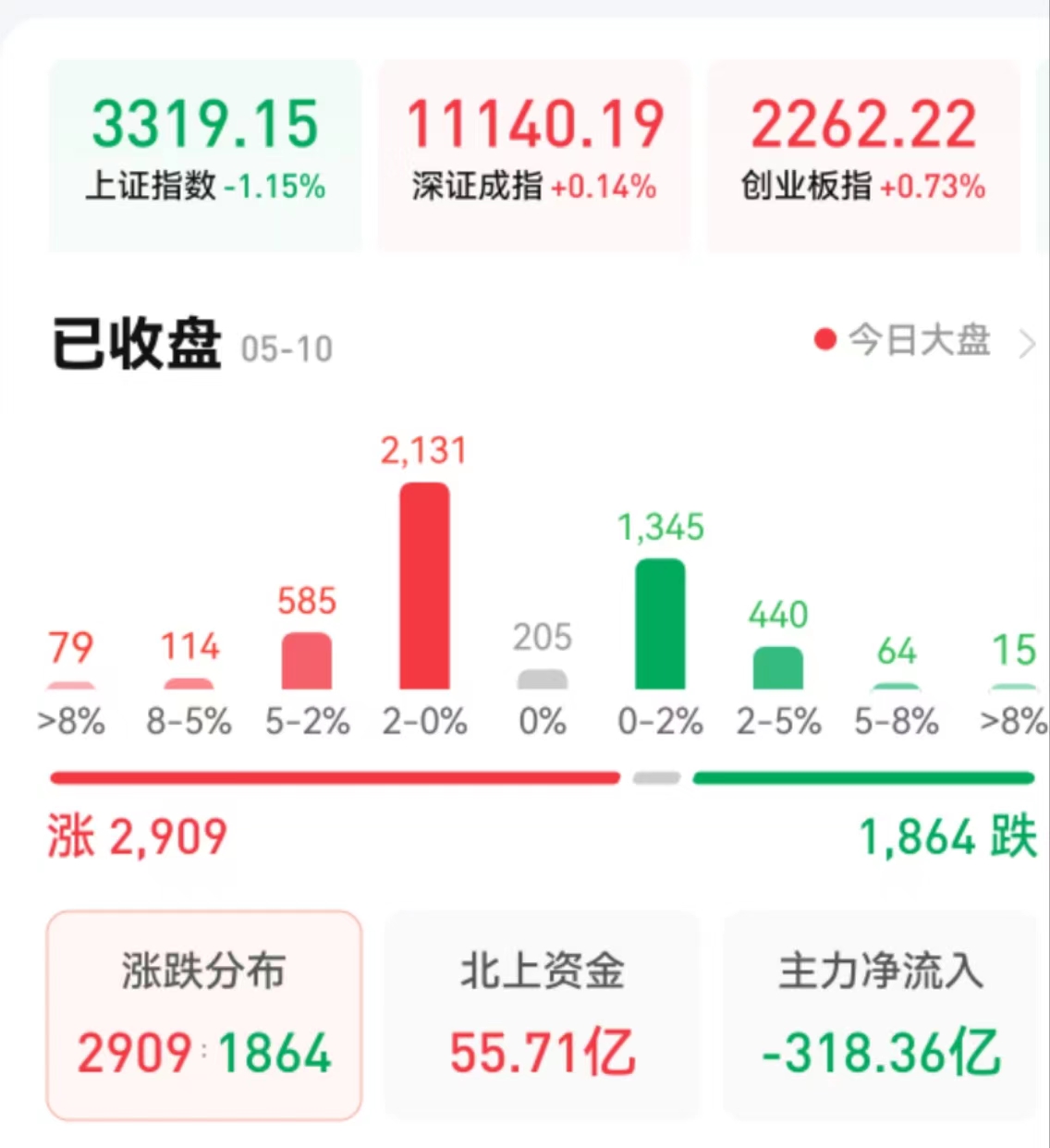 周三(5月10日),A股三大股指震蕩分化,漲跌不一。截至收盤,上證指數(shù)跌1.15%報(bào)3319.15點(diǎn),深證成指漲0.14%報(bào)11140.19點(diǎn),創(chuàng)業(yè)板指漲0.73%報(bào)2262.22點(diǎn);兩市合計(jì)成交金額達(dá)10201億元,連續(xù)第24個(gè)交易日突破萬億元,北向資金凈買入55.71億元。總體上看,兩市個(gè)股漲多跌少。其中,漲停個(gè)股達(dá)40只,跌停個(gè)股達(dá)49只。