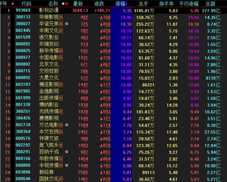 具體看,截至5月11日上午收盤,影視動漫板塊漲幅居首達(dá)5.35%,掀起漲停潮。其中,包括華策影視、中南文化、新華傳媒、歡瑞世紀(jì)、中國電影、出版?zhèn)髅?、橫店影視等在內(nèi)的超10只概念股集體漲停。