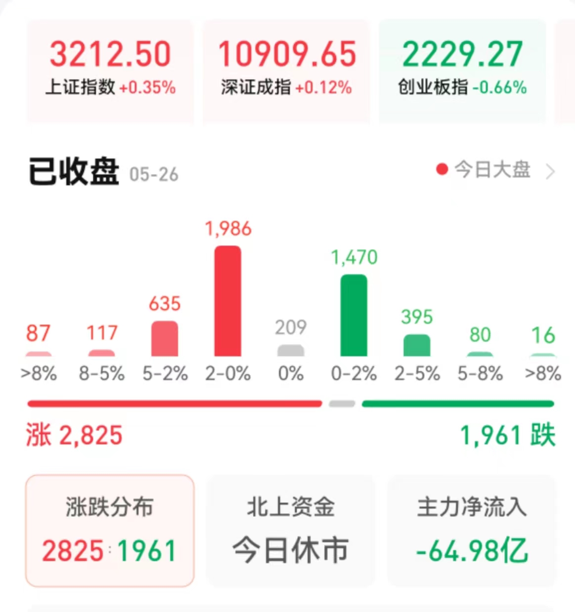 周五(5月26日),A股三大股指震蕩分化,漲跌不一。截至收盤(pán),上證指數(shù)漲0.35%報(bào)3212.50點(diǎn),深證成指漲0.12%報(bào)10909.65點(diǎn),創(chuàng)業(yè)板指微跌0.66%報(bào)2229.27點(diǎn);兩市合計(jì)成交8205億元。總體上看,兩市個(gè)股漲多跌少。其中,漲停個(gè)股達(dá)52只,跌停個(gè)股達(dá)25只。