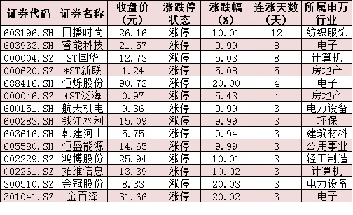 表:連續(xù)上漲3日且今日收盤(pán)漲停個(gè)股情況: