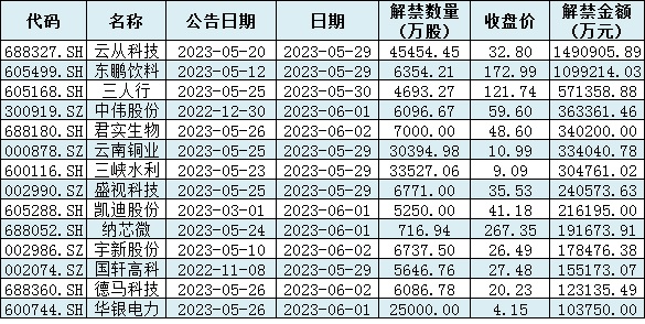 與此同時,統(tǒng)計顯示,下周(5月29日-6月2日)共有75家公司限售股陸續(xù)解禁,按最新收盤價計算,解禁市值為627.95億元。從解禁市值來看,云從科技-UW(149.09億元)、東鵬飲料(109.92億元)等公司解禁金額均超100億元。
