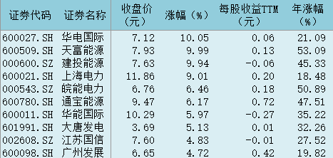 表:今日火力發(fā)電板塊漲幅前十個股一覽