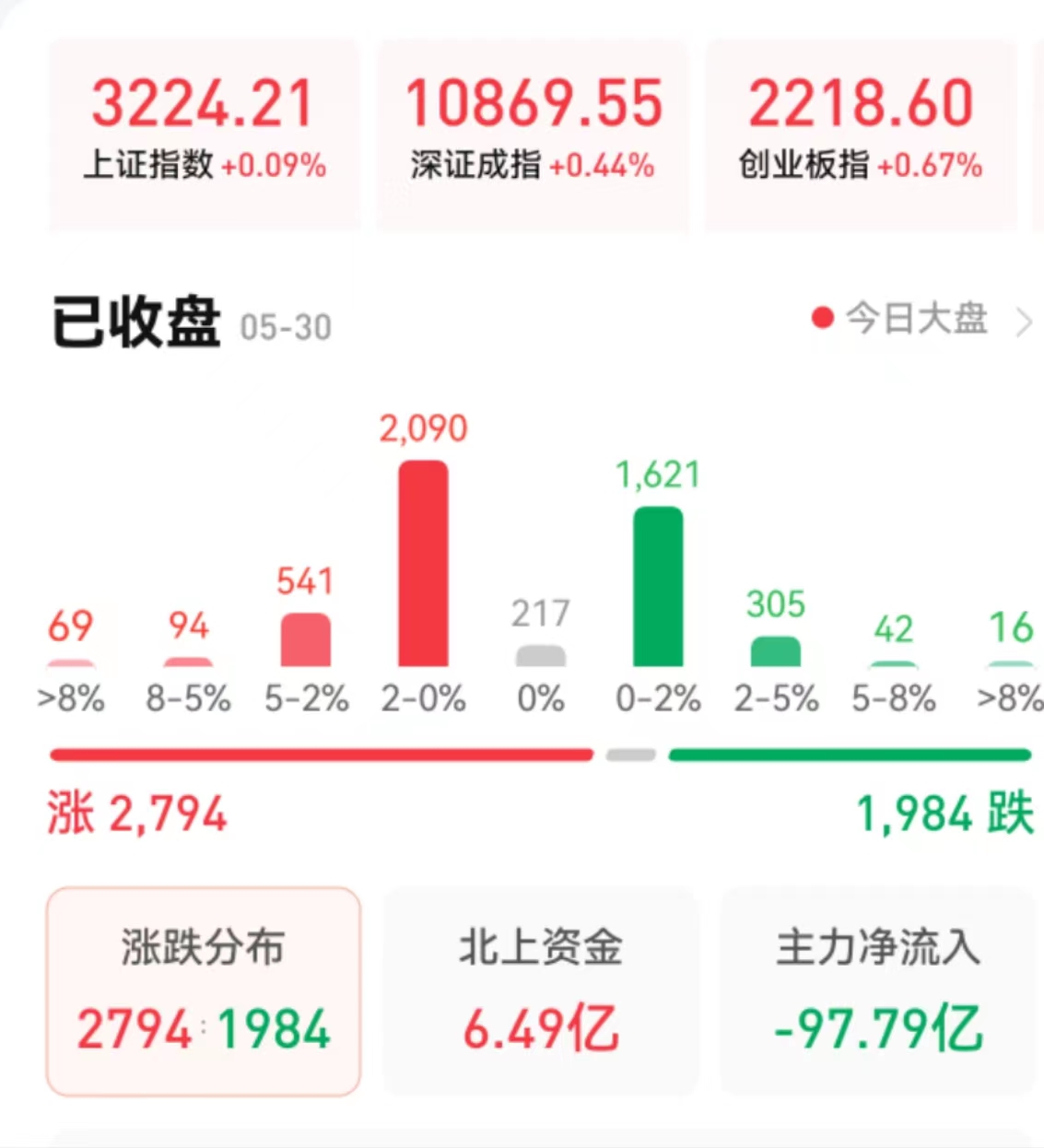 周二(5月30日),A股三大股指上演了V型反轉(zhuǎn)的走勢(shì),探底回升,全線翻紅。截至收盤,上證指數(shù)微漲0.09%報(bào)3224.21點(diǎn),深證成指漲0.44%報(bào)10869.55點(diǎn),創(chuàng)業(yè)板指漲0.67%報(bào)2218.6點(diǎn);兩市合計(jì)成交金額達(dá)9332億元,北向資金凈買入6.49億元??傮w上看,兩市個(gè)股漲多跌少。其中,漲停個(gè)股達(dá)51只,跌停個(gè)股達(dá)25只。