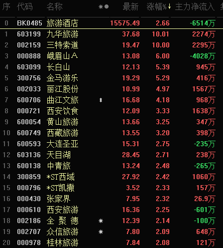 從早盤表現(xiàn)強勢的旅游酒店行業(yè)看,交易中的34只成份股中有31只上漲,其中,有5只個股漲幅超5%。資金方面,有6514萬元大單資金凈流出該行業(yè)。