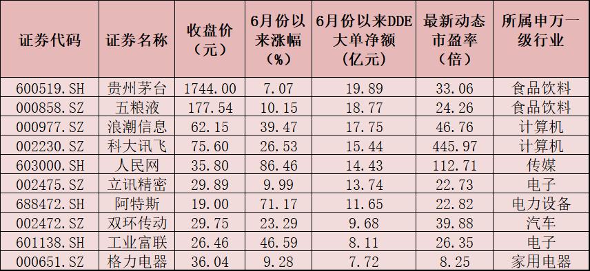 表:6月份以來獲大單資金凈買入額居前十的個(gè)股一覽