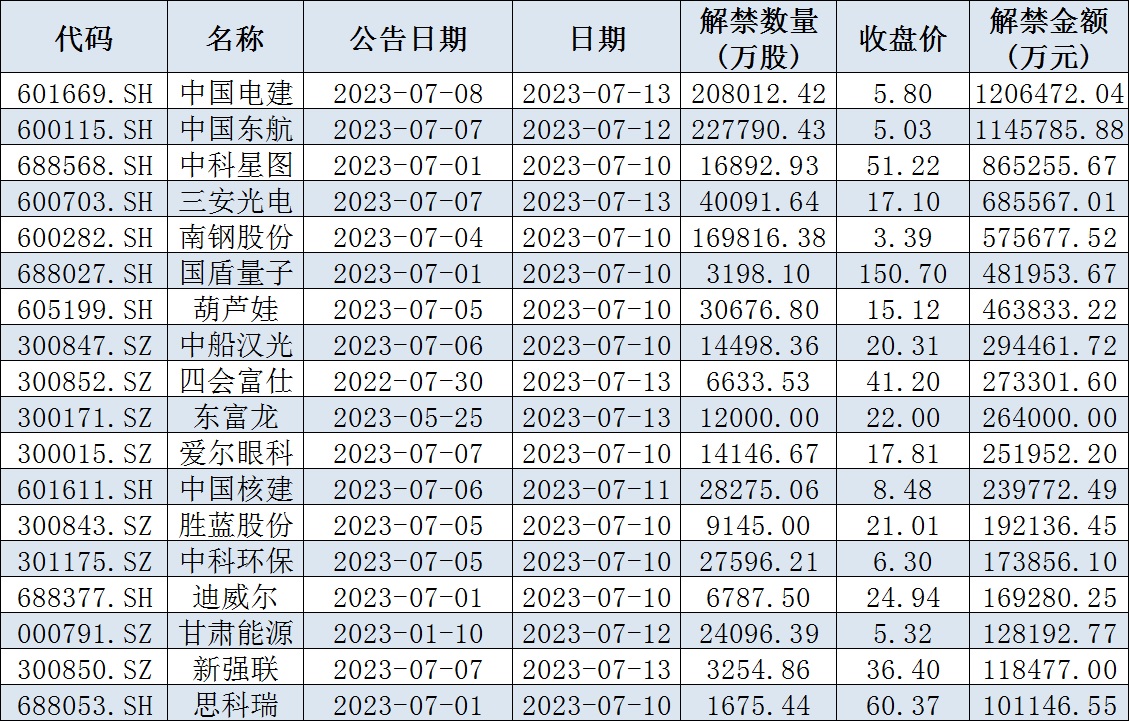 表:下周解禁金額超10億元的公司情況