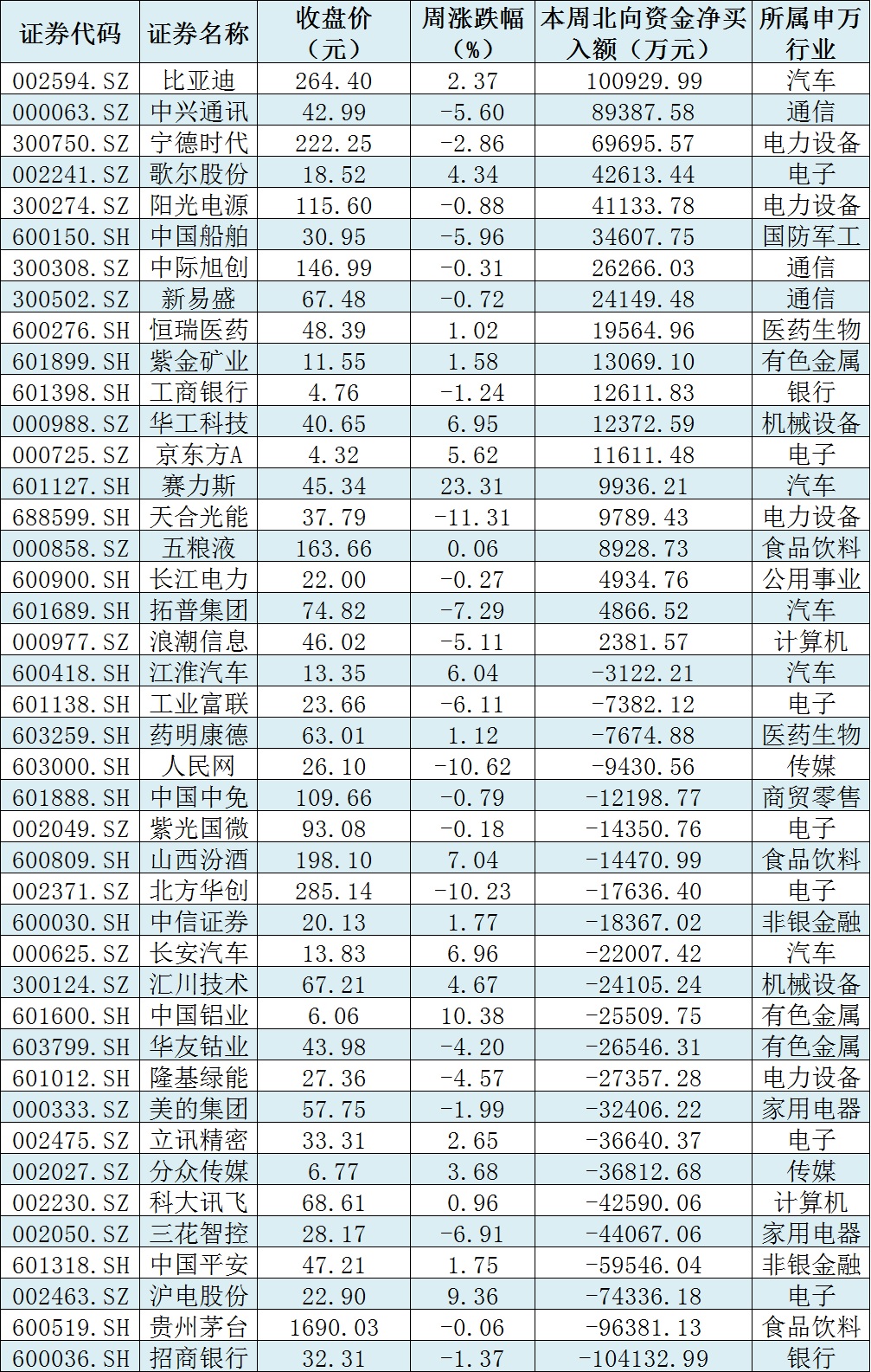 資金方面,本周北向資金累計(jì)凈賣出金額達(dá)91.6億元。從前十大成交活躍股來看,本周,比亞迪、中興通訊、寧德時(shí)代等3只個(gè)股,北向資金凈買入金額均超6億元。另外,招商銀行、貴州茅臺(tái)、滬電股份等個(gè)股遭北向資金凈賣出金額均超7億元。