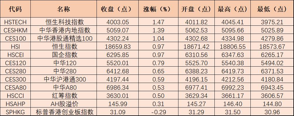 7月11日,港股市場(chǎng)指數(shù)普遍走強(qiáng),截至收盤(pán),恒生指數(shù)漲0.97%,報(bào)18659.83點(diǎn);恒生科技指數(shù)漲1.47%,報(bào)4003.05點(diǎn),兩大指數(shù)均為連續(xù)第2個(gè)交易日實(shí)現(xiàn)上漲。