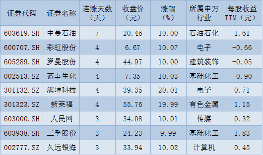 表:連續(xù)上漲3日且今日收盤漲停股一覽