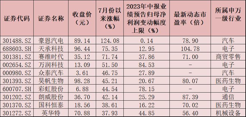 表:7月份以來(lái)漲幅居前十的業(yè)績(jī)預(yù)計(jì)增長(zhǎng)公司一覽