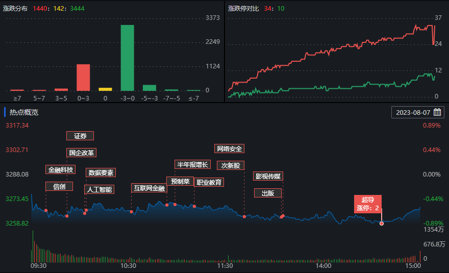 周一(8月7日),A股三大股指集體收跌。截至收盤,上證指數(shù)跌幅0.59%報(bào)3268.83點(diǎn),深證成指指跌0.83%報(bào)11145.03點(diǎn),創(chuàng)業(yè)板指跌1%報(bào)2240.77點(diǎn);兩市合計(jì)成交金額8900.77億元。北向資金凈賣出24.98億元,其中,滬股通凈買入10.76億元,深股通凈賣出35.74億元??傮w來看,A股個(gè)股跌多漲少,超3400只個(gè)股下跌,其中,漲停個(gè)股34只,跌停個(gè)股10只。