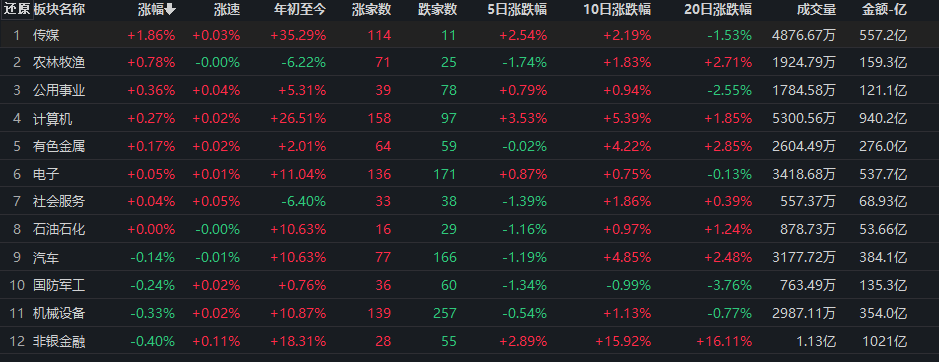 從31個(gè)申萬一級(jí)行業(yè)看,8月7日僅有8個(gè)行業(yè)上漲,傳媒行業(yè)漲幅居首,達(dá)1.86%,農(nóng)林牧漁行業(yè)高開震蕩,漲0.78%。下跌方面,房地產(chǎn)領(lǐng)跌,跌幅達(dá)3.40%,醫(yī)藥生物跌超2%,美容護(hù)理、建筑材料、通信、建筑裝飾、鋼鐵均跌超1%。